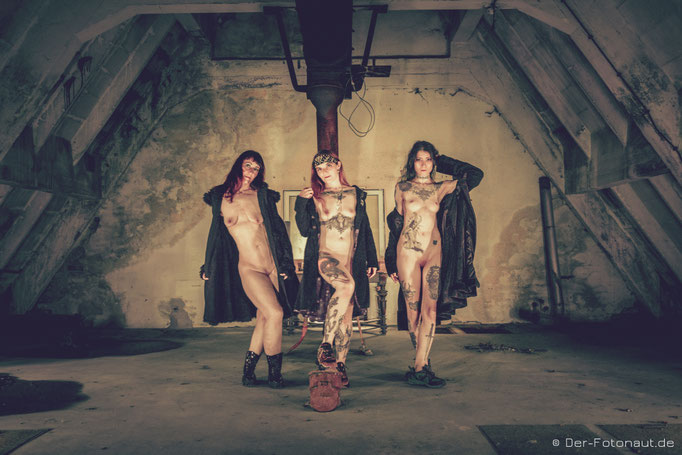 Rein in die Örtlichkeit. Handy-Alarm auf 35Minunten gestellt. Bier aufmachen. Schnell geschaut, wo man was machen kann. Zwei Ecken für gut befunden. Die Mädels haben sich bis auf die Unterwäsche ausgezogen. Kurz erklärt was und wie. Erste Runde in 18 Minuten geschafft! Noch 17 Minuten Zeit! Schnell zur nächsten Ecke. Jeder nahm etwas auf den Weg mit, inklusive Bier. Noch 5 Minuten Zeit. Vier kleinere Fotolampen aufgebaut. Mädels haben sich währenddessen nackig gemacht und Mantel übergezogen. Kurz erklärt was und wie. Mädels haben sich in Pose gebracht. Ich machte Bilder. Handy gibt Alarm. Wir: schnell alles wieder zusammenräumen, sich sammeln, alles einpacken, Bier austrinken und wieder los.