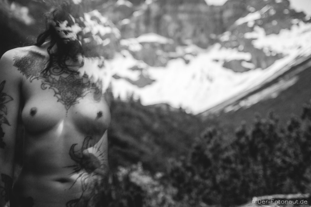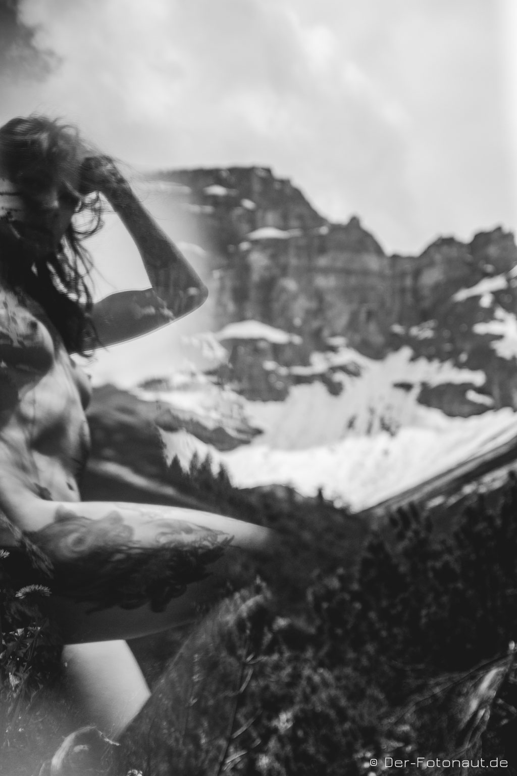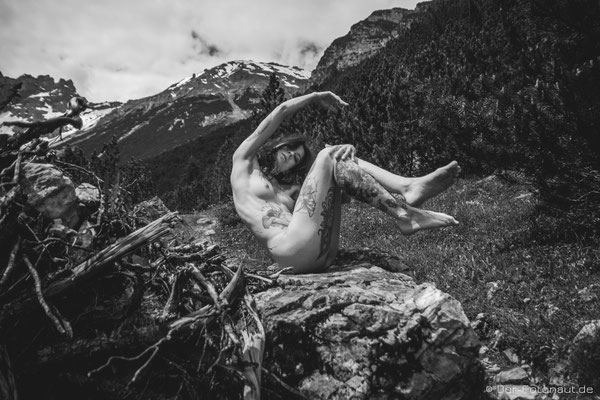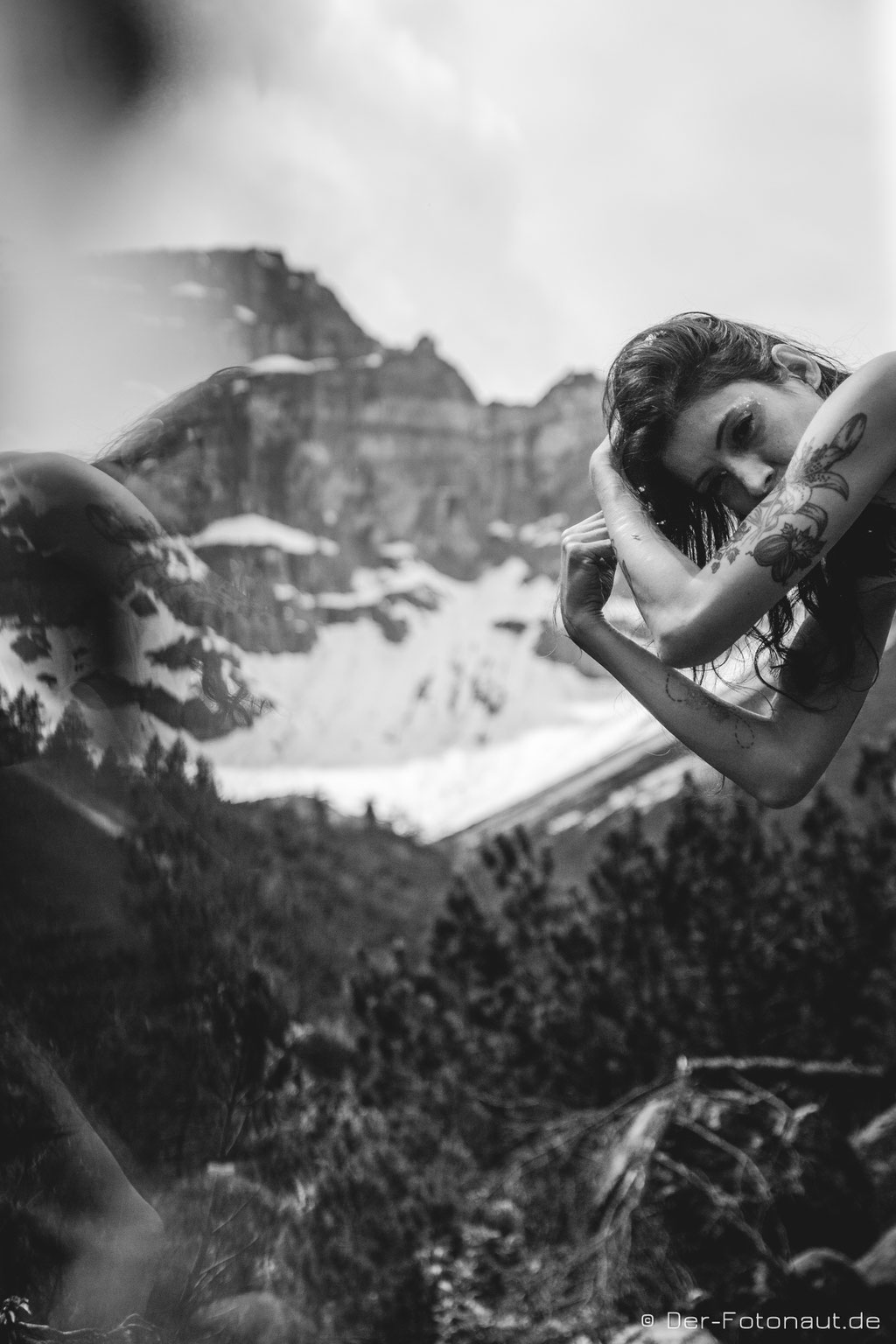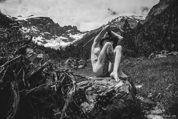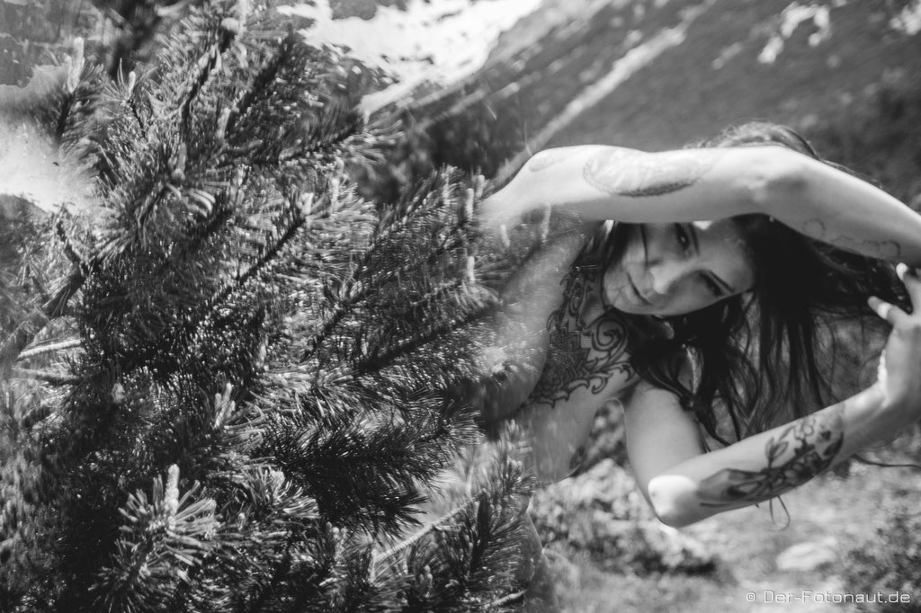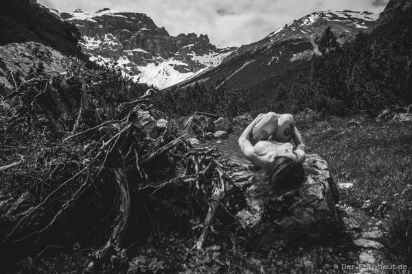 Wir haben das schon alles gemacht, so als Alpendauergäste. Peter wollte während unseres letzten Aufenthalts mal etwas anderes probieren. Er sagte mir: „Nimm mal dein Korsett mit!“ und ich war erst skeptisch. Ich dachte erst, wenn der Herr hier so Pin-Up Bilder vor Bäumen machen will, dann bin ich raus. Als wir aber immer tiefer in den Wald gingen, fanden wir ein kleines Baumstamm-Tipi aus Totholz und Peter meinte nur: „Hier ist es gut!“ und ich so „öhhhh... ok“