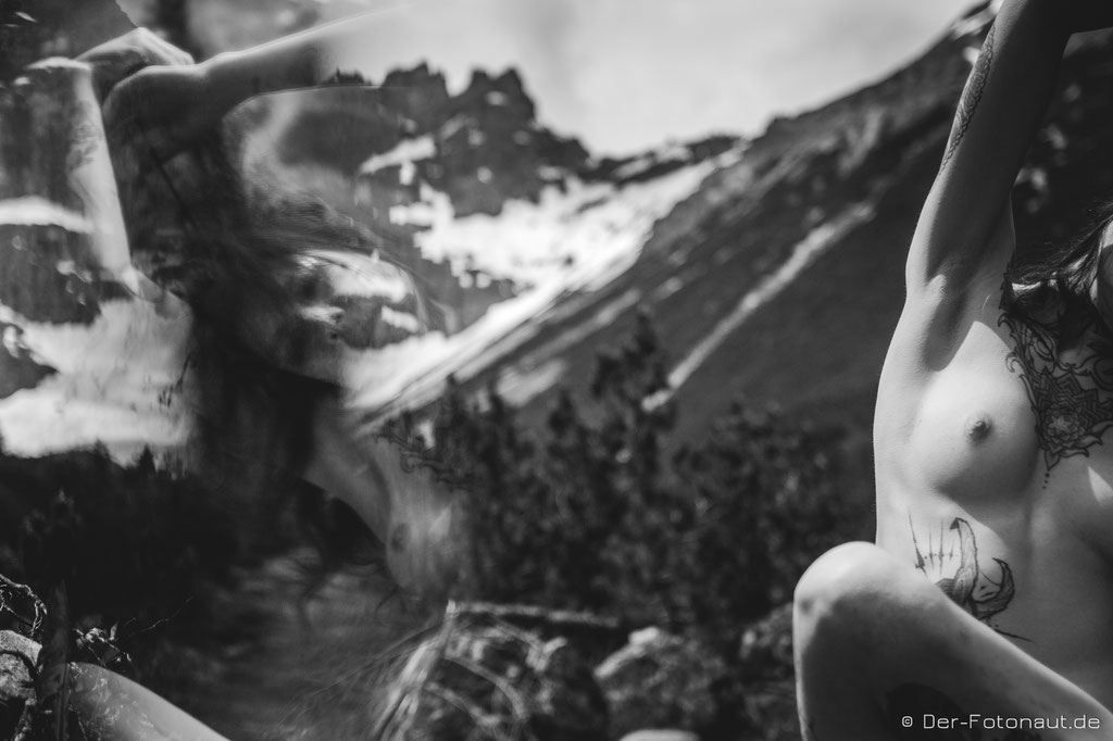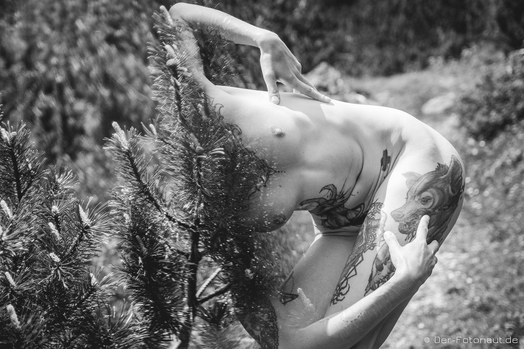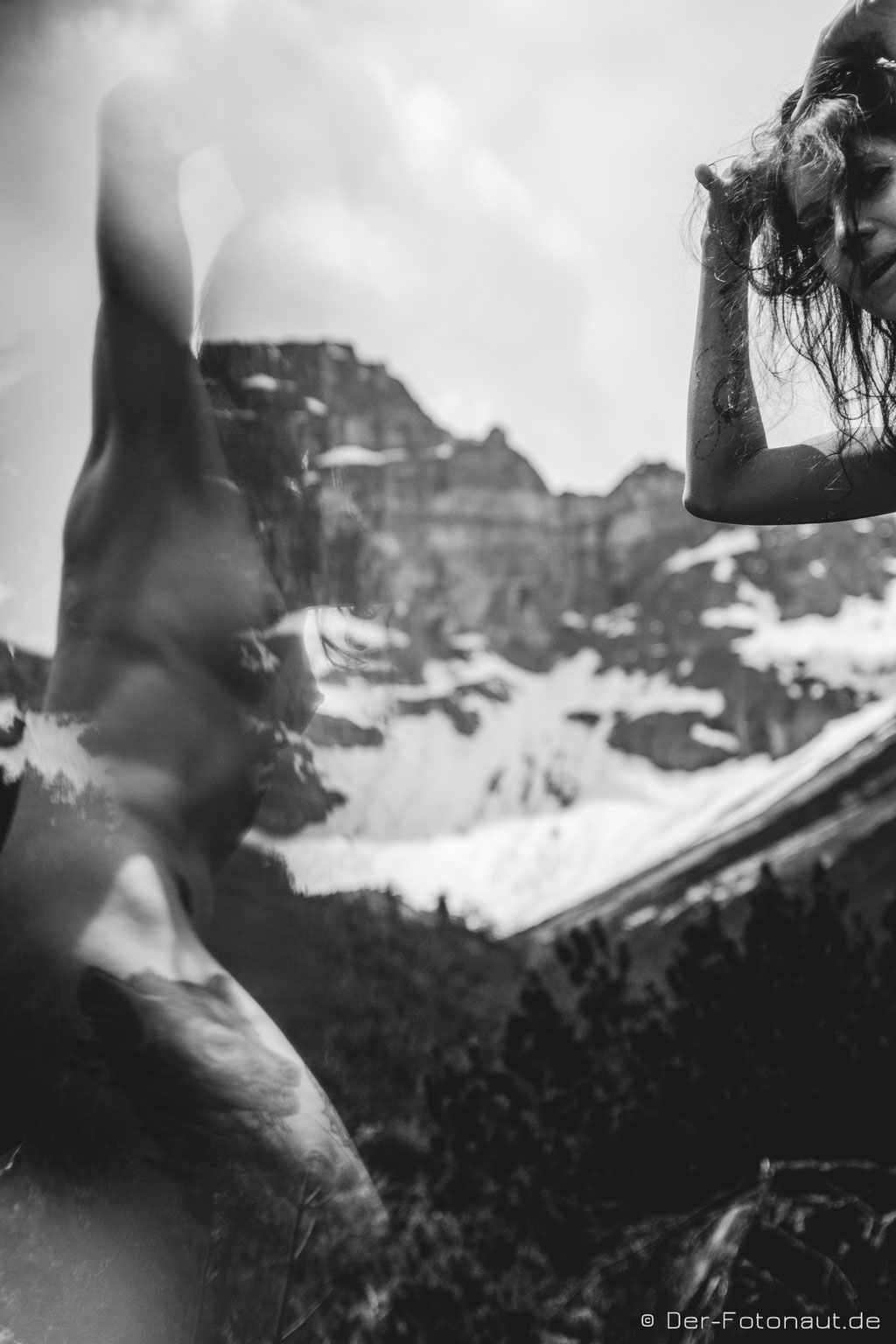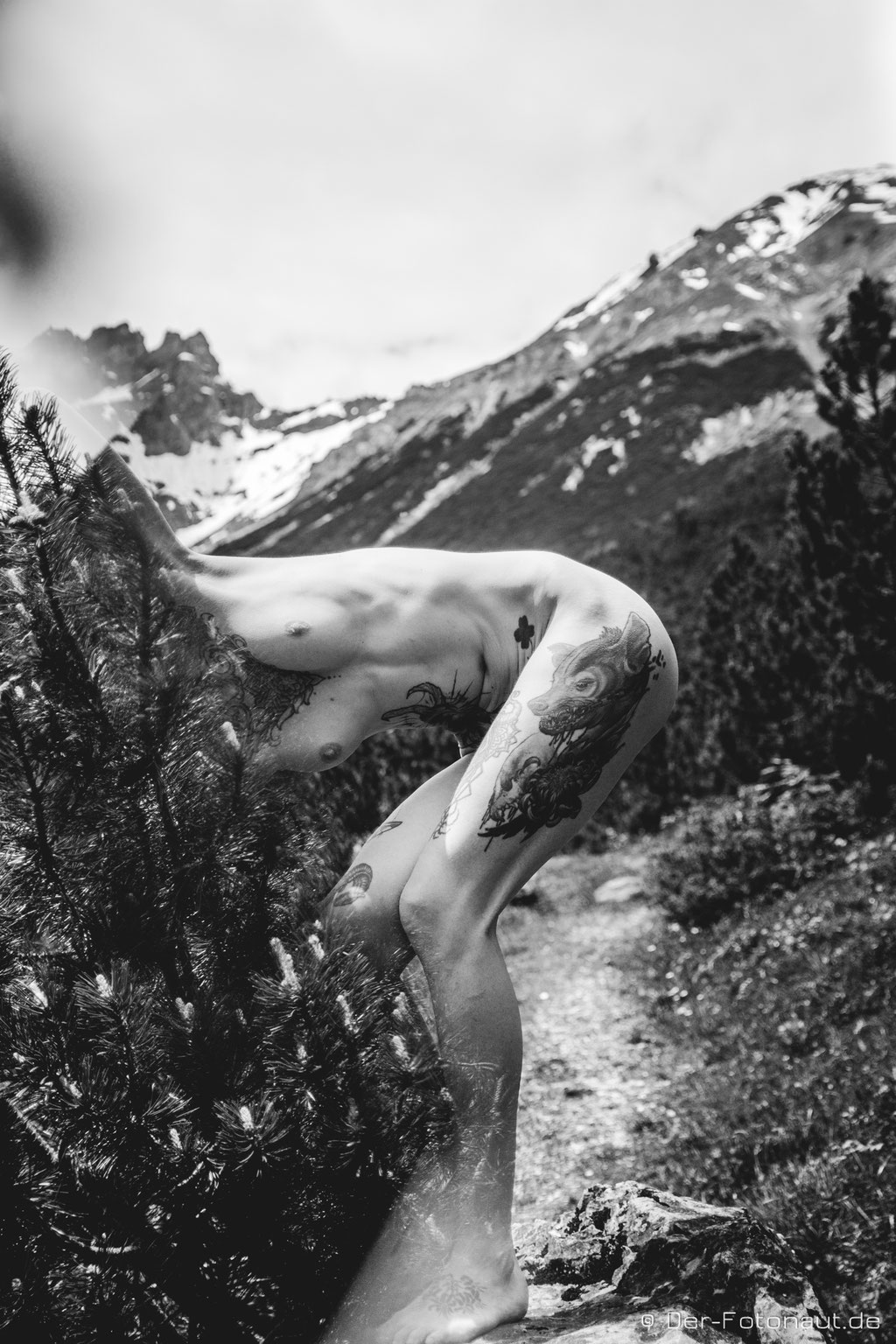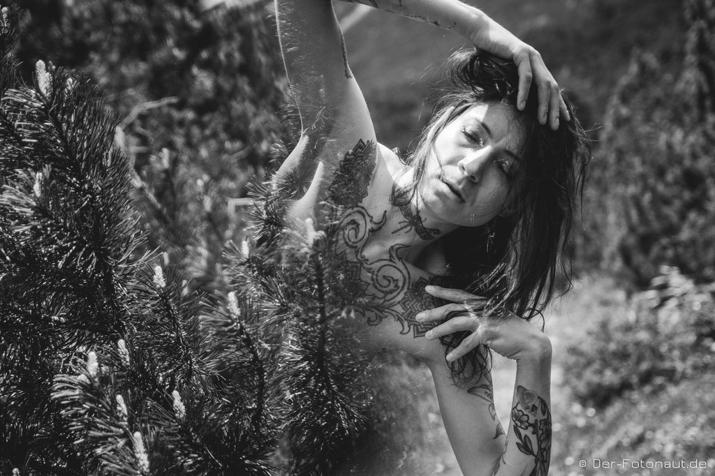 Wir haben das schon alles gemacht, so als Alpendauergäste. Peter wollte während unseres letzten Aufenthalts mal etwas anderes probieren. Er sagte mir: „Nimm mal dein Korsett mit!“ und ich war erst skeptisch. Ich dachte erst, wenn der Herr hier so Pin-Up Bilder vor Bäumen machen will, dann bin ich raus. Als wir aber immer tiefer in den Wald gingen, fanden wir ein kleines Baumstamm-Tipi aus Totholz und Peter meinte nur: „Hier ist es gut!“ und ich so „öhhhh... ok“